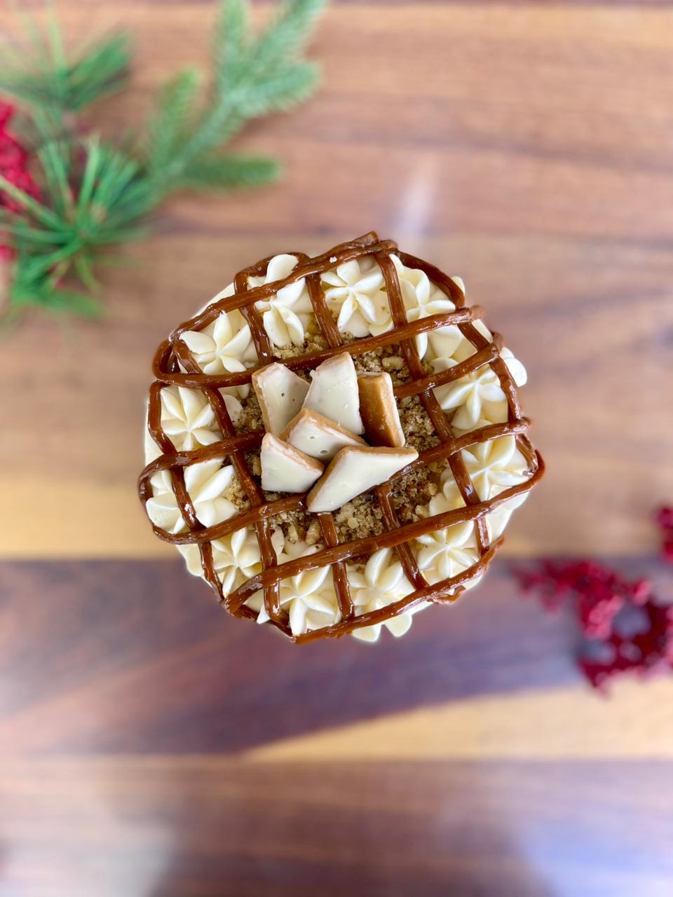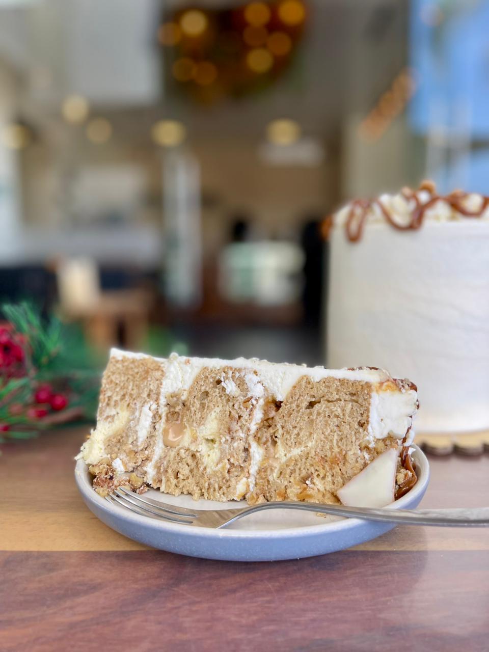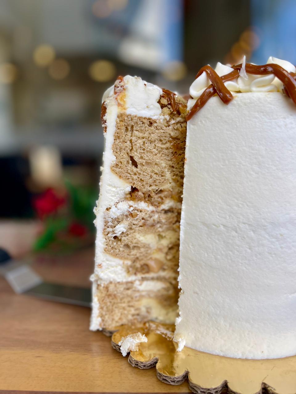Pastel con capas de pastel de canela con manzana y cheesecake, relleno de nuez y caramelo. Decorado con betún de queso crema, cajeta y toffee de canela con chocolate blanco.
