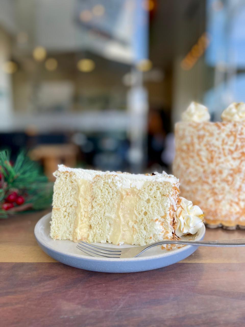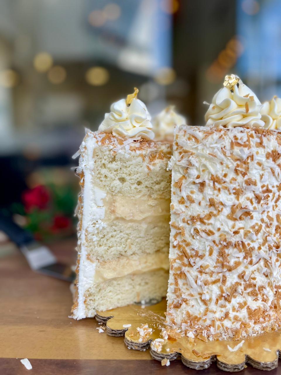 Pastel suavecito de vainilla y crema pastelera de coco. Decorado con betún de queso crema y cubierto de coco tostado.