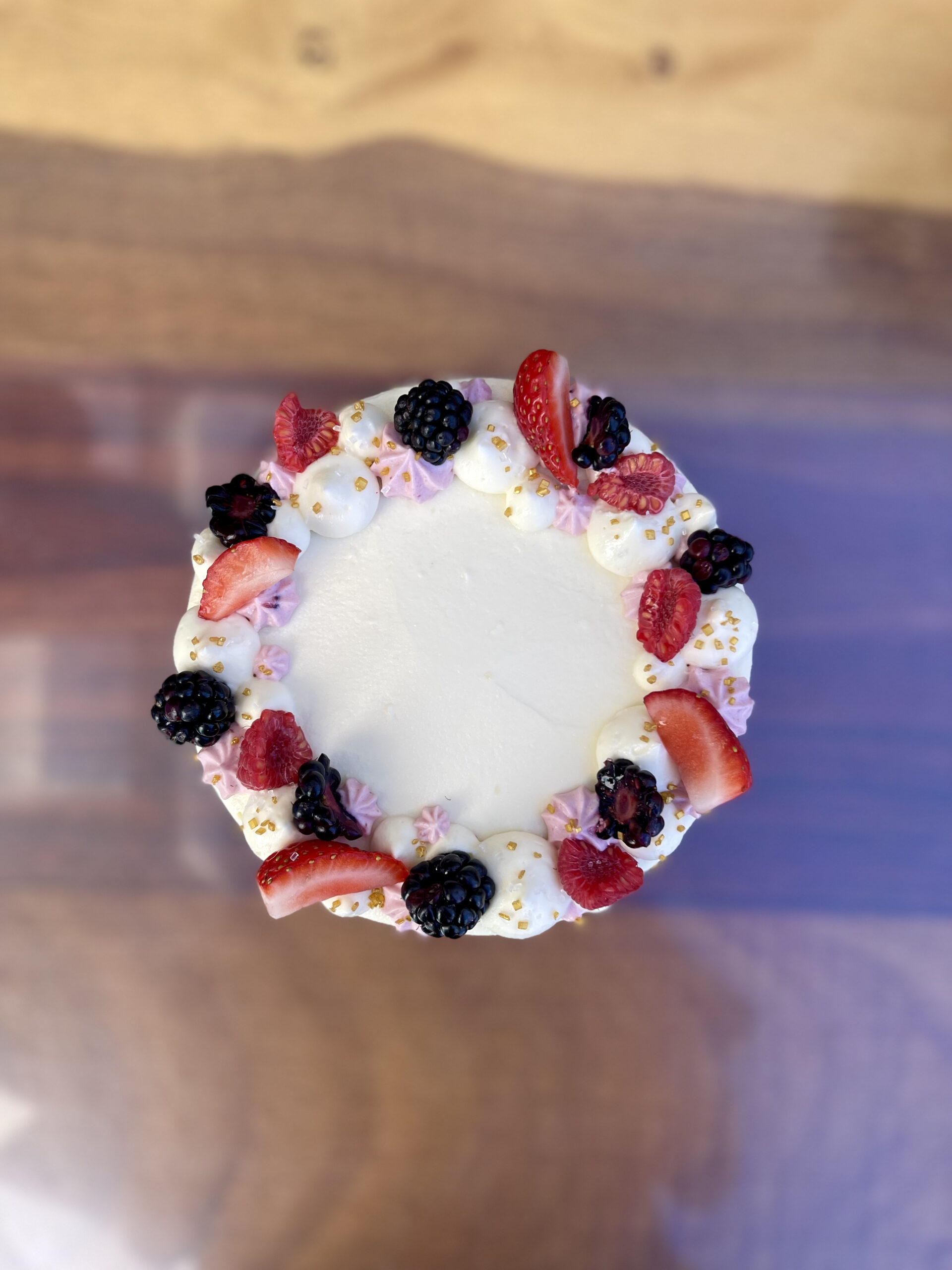 Con capas de pastel de vanilla, mermelada de moras y mousse suavecito de moras. Decorado con betún de crema y frutos rojos.
