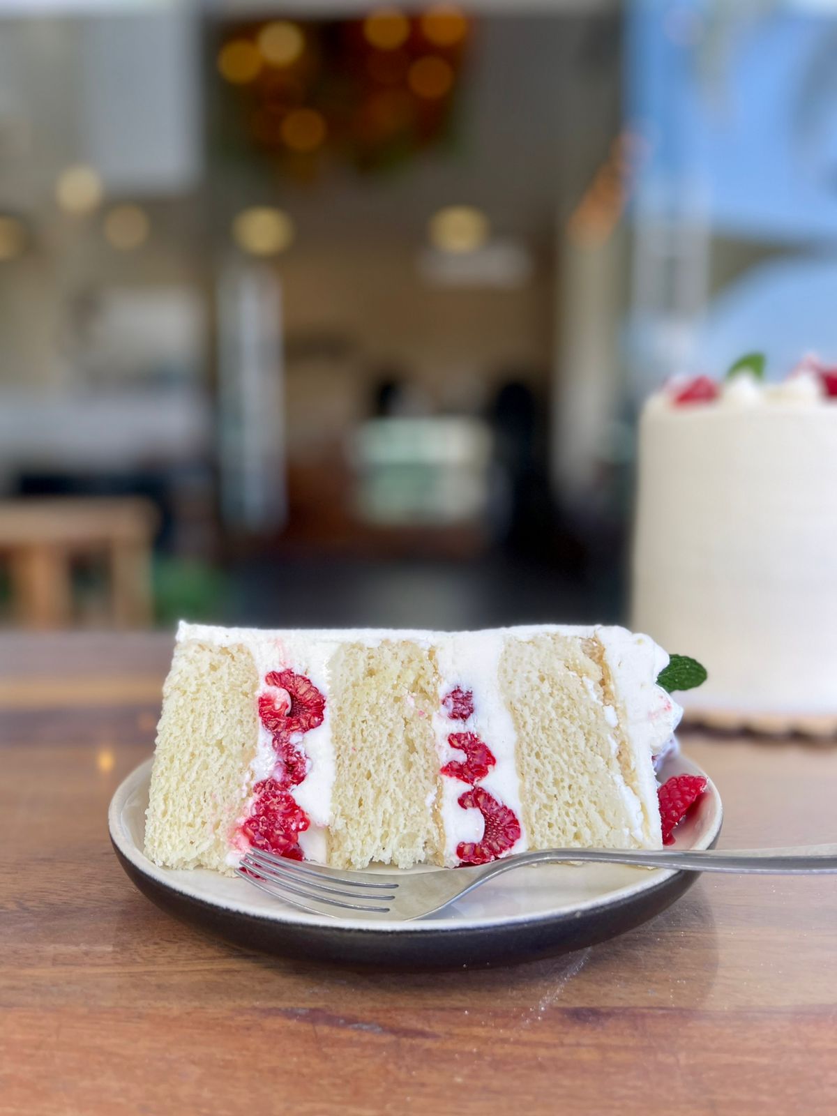Pastel suavecito de vainilla, crema de vaina de vainilla y frambuesas frescas. Decorado con betún de queso crema, frambuesas, menta y azúcar glass.